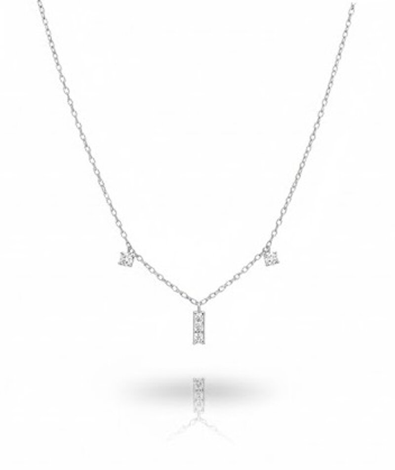 La purezza dell'argento incontra la precisione del taglio quadrato. Questa collana è un inno alla simmetria: un pendente centrale con tre zirconi quadrati incastonati, accompagnato da due zirconi singoli che danzano lungo la catena. Un gioco di riflessi che illumina il volto con uno stile moderno e ultra-chic.