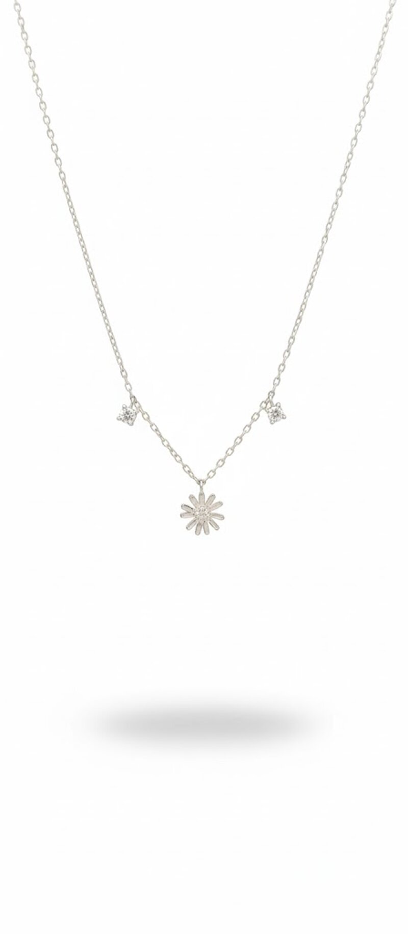Il design presenta una raffinata margherita centrale, simbolo di purezza e rinascita. Ai lati del fiore, due zirconi taglio quadrato (punti luce) incorniciano il pendente, aggiungendo un tocco di moderna eleganza e una simmetria impeccabile.