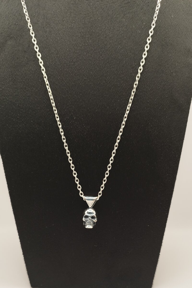 Un pezzo dal fascino enigmatico. La nostra Collana "Memento Mori" combina l'eleganza sobria dell'argento con l'iconografia potente e profonda del teschio, un classico rivisitato in chiave sofisticata. Il pendente presenta una scultura dettagliata, che gioca con luci e ombre, trasformando un simbolo di caducità in un accessorio di eterna bellezza.