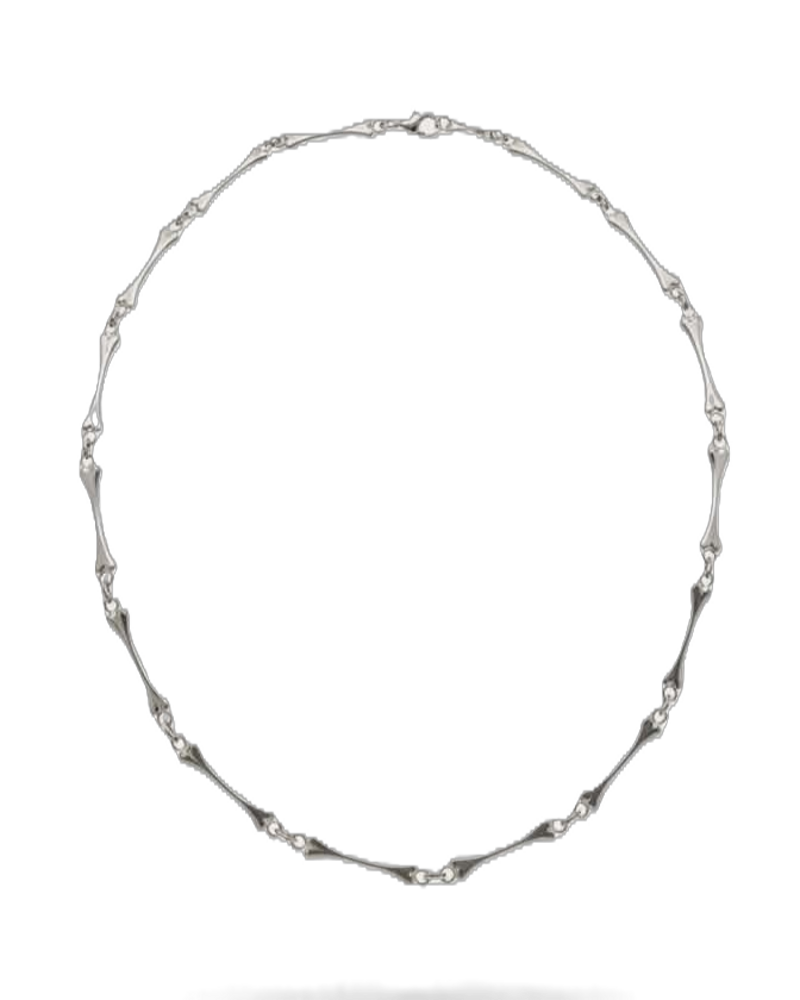 Eleva il tuo stile con un pezzo unico che fonde artigianalità e design d'avanguardia. Questa collana è interamente realizzata in pregiato argento 925, caratterizzata da una serie di maglie modellate a forma di ossa che si susseguono con un ritmo organico e sofisticato.