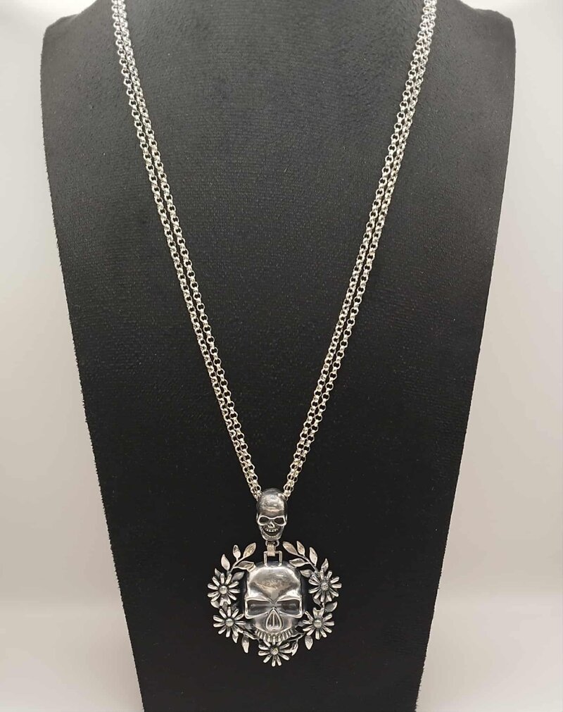 Le margherite in contrasto con il teschio aggiungono un elemento di sorpresa e freschezza, perfetto per chi ama distinguersi dalla massa. Inoltre, la nostra collana è disponibile in diverse finiture, tra cui argento e oro, permettendoti di scegliere quella che meglio si adatta al tuo stile personale.