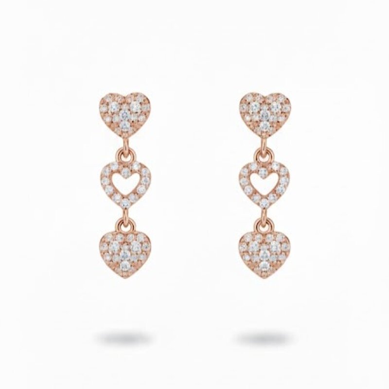 Trilogia di Cuori. L'eleganza incontra il romanticismo in questi orecchini realizzati in argento 925. La struttura presenta una sequenza verticale di tre cuori, ciascuno impreziosito da un pavé di zirconi selezionati per la loro brillantezza. La chiusura sicura e la leggerezza del design li rendono ideali da indossare tutto il giorno, portando una nota di luce preziosa a ogni outfit.
