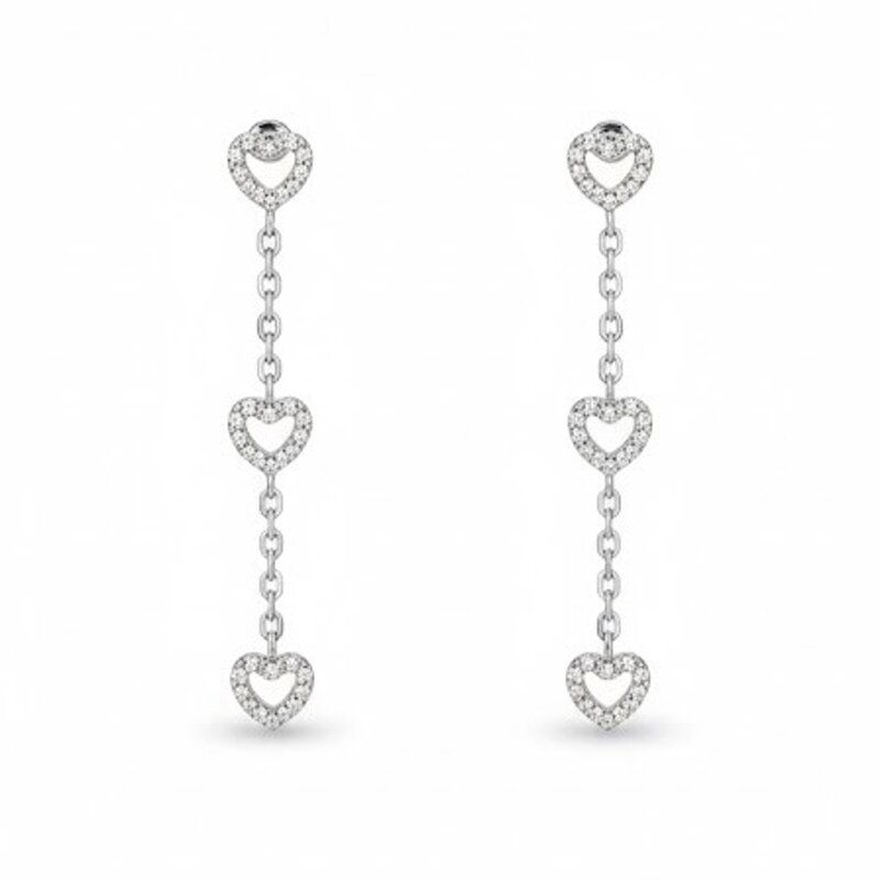 Leggeri come un soffio. ✨ Tre cuori traforati in argento che si rincorrono in una danza delicata. Il design vuoto all'interno rende questi orecchini pendenti incredibilmente ariosi e confortevoli, perfetti per chi cerca un accessorio di carattere che non appesantisce il lobo. Un gioco di silhouette che incornicia il volto con eleganza moderna. 🤍